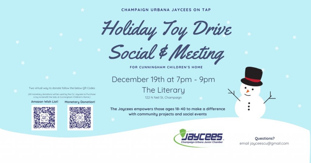 Join the Champaign Urbana Jaycees as we hold our monthly chapter meeting and finish off our Holiday Toy Drive for Cunningham Children’s Home at The Literary on the December 19th at 7:00 PM. Bring a toy if you can, come out and socialize and learn about what our plans are going to be as we move into 2025.  We will be discussing upcoming projects for current members, however all are welcome to attend to learn more about the Jaycees!